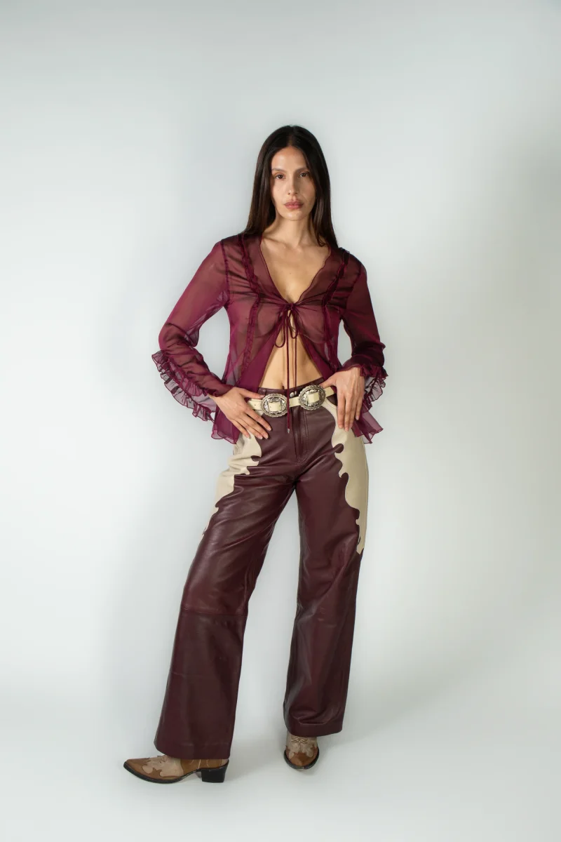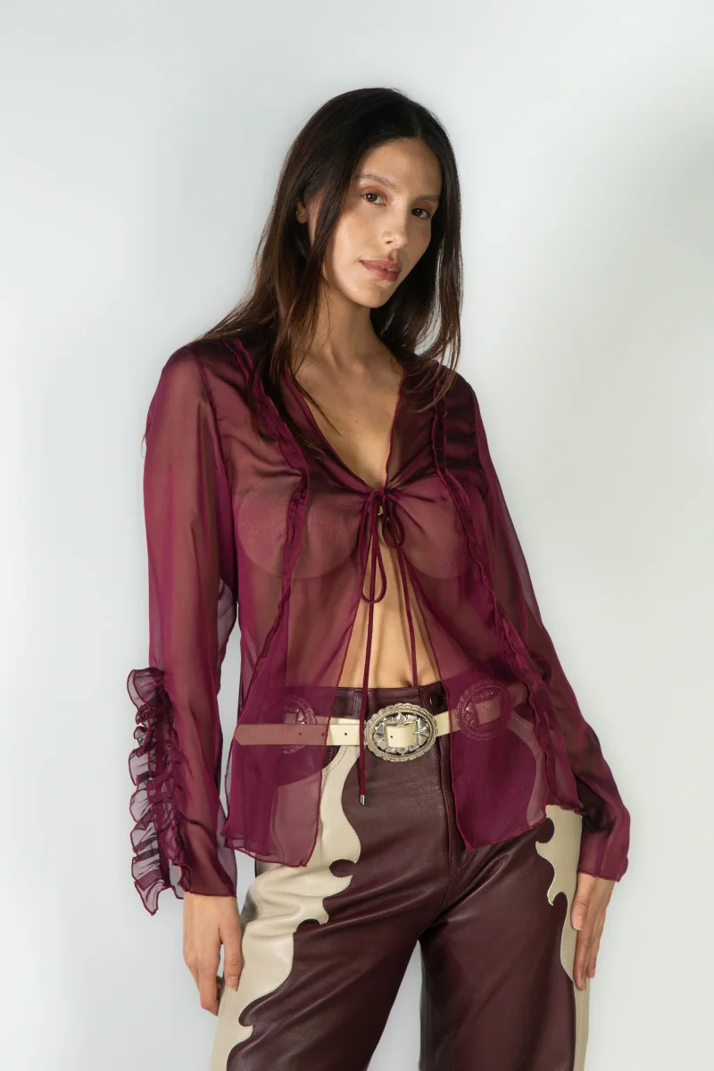 BLUSA DE CHIFFON CON LAZOS DE PIEL Y PUNTAS METÁLICAS.
