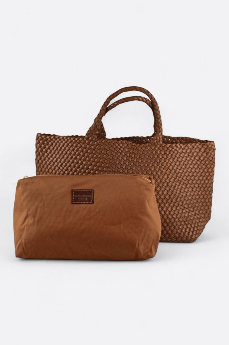 El Tote Mirella combina la artesanía tradicional con un diseño práctico, con una malla de cuero tejida a mano que le aporta un toque de sofisticación.
