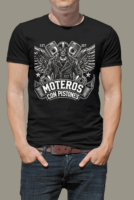 Esta camiseta negra es una auténtica declaración de pasión por las motocicletas y el estilo de vida libre de los moteros. Su diseño emblemático muestra a un motero con casco, chaqueta de cuero y alas detrás, rodeado de pistones y estrellas, evocando el espíritu indomable y la fuerza de los amantes de la carretera.