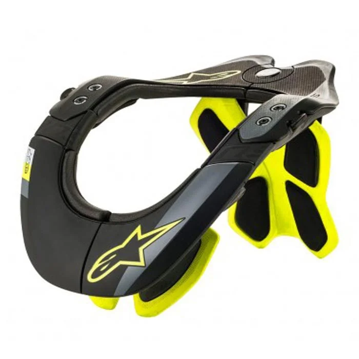- El COLLARIN ALPINESTARS BNS TECH-2 NEGRO/AMARILLO FLÚOR está construido a partir de un compuesto de polímero de fibra avanzado y de alto rendimiento para ofrecer:
