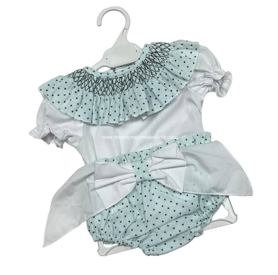 La camisa blanca de popelín con el cuello redondo y el punto inglés que combina con el estampado de las braguitas es un detalle muy bonito. Además, la apertura por detrás con botones facilita el vestir, lo cual es siempre un plus para los papás.