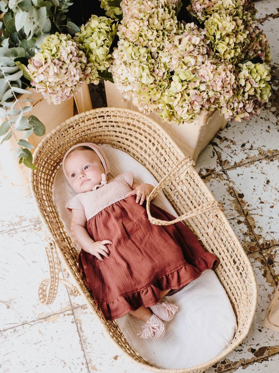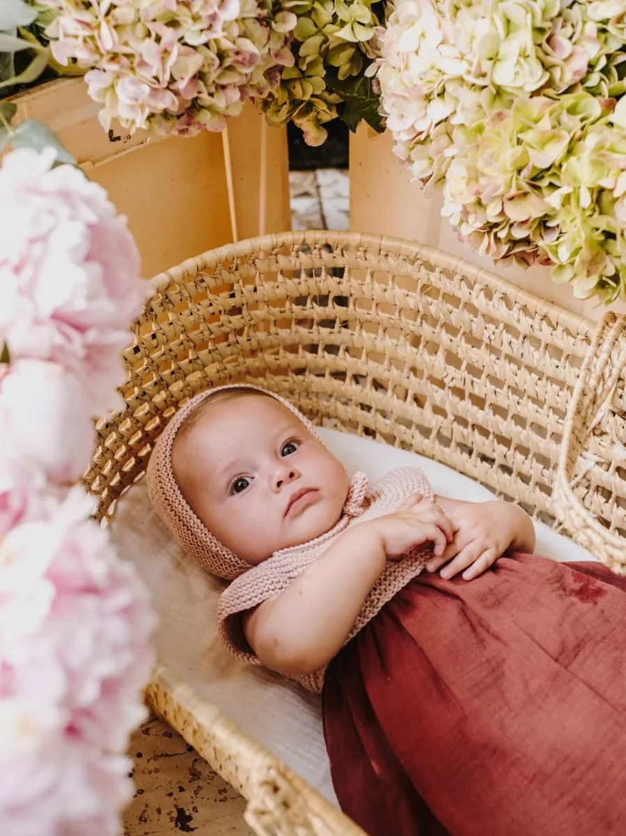 *** En las fotos, Casilda lleva faldón Juno en algodón orgánico rosa ballet y falda de gasa de algodón en color caldero. Completa tu look con nuestro kit de Capota Ivy del mismo color (ver aquí).