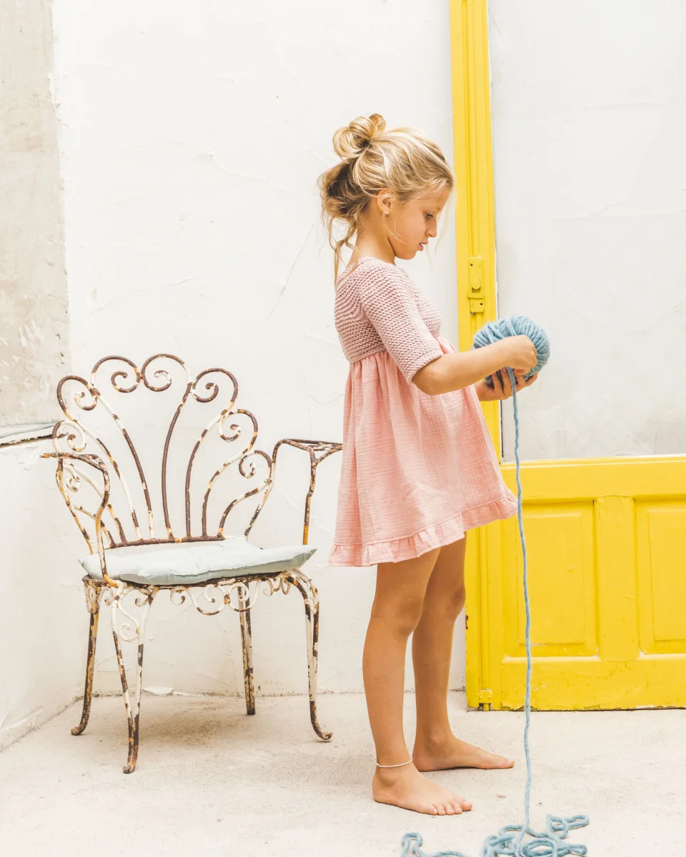 El vestido Lola para niña lo puedes hacer para primavera/verano (en algodón orgánico) y/o otoño/invierno (en lana merino). Es nuestro diseño más emblemático con manga al codo y detalle de hendidura en el cuello. A partir de la talla 2 años la falda incluida en nuestro kit es corta, cerrada (en las tallas inferiores es abierta por detrás para facilitar el cambio de pañal) y está rematada con un volante.