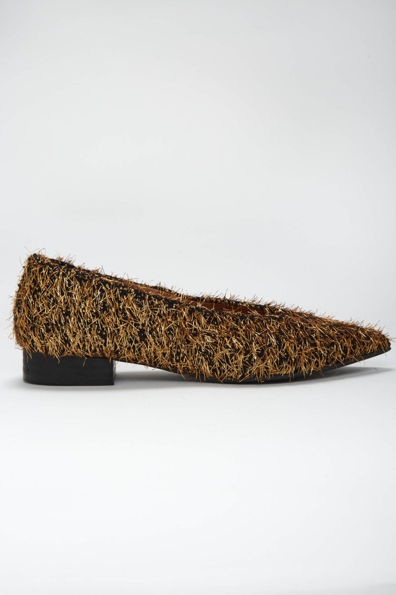 Their metallic furry fabric in black and gold is a statement of intent: elegance with attitude. The kind of shoe that turns a simple look into something special — effortlessly, without overdoing it.