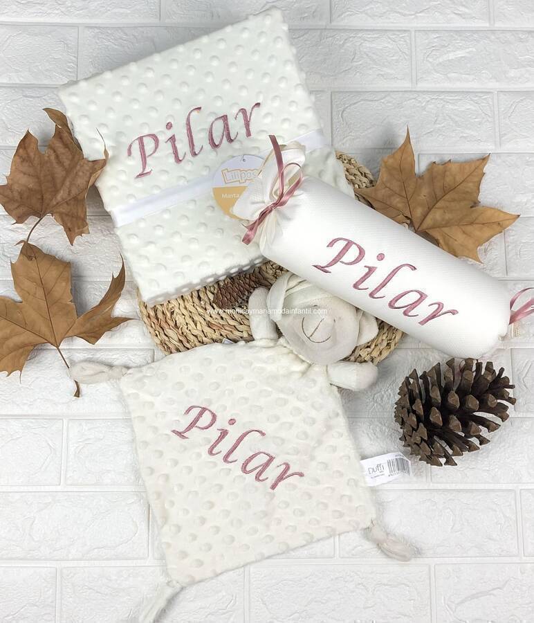 Color cojin antivuelco rosa, celeste, beige, blanco.