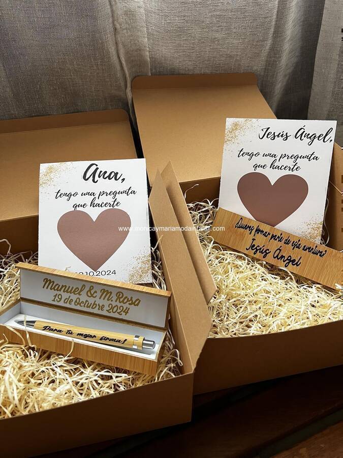 Caja compuesta de un rasca para que esa persona se lleve la sorpresa de que va a ser testigo de vuestra boda y un bolígrafo con su cajita. Además, la caja es personalizada como más os guste.