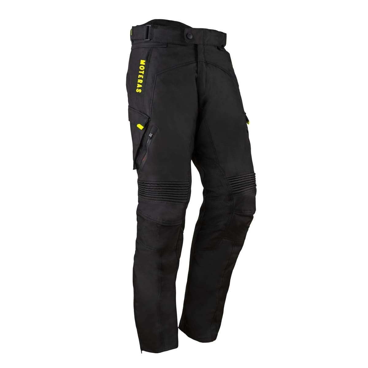 Pantalones de moto negro con detalles amarillos, diseño de pantalones ergonómicos para motoristas, ropa y moderna para moto.