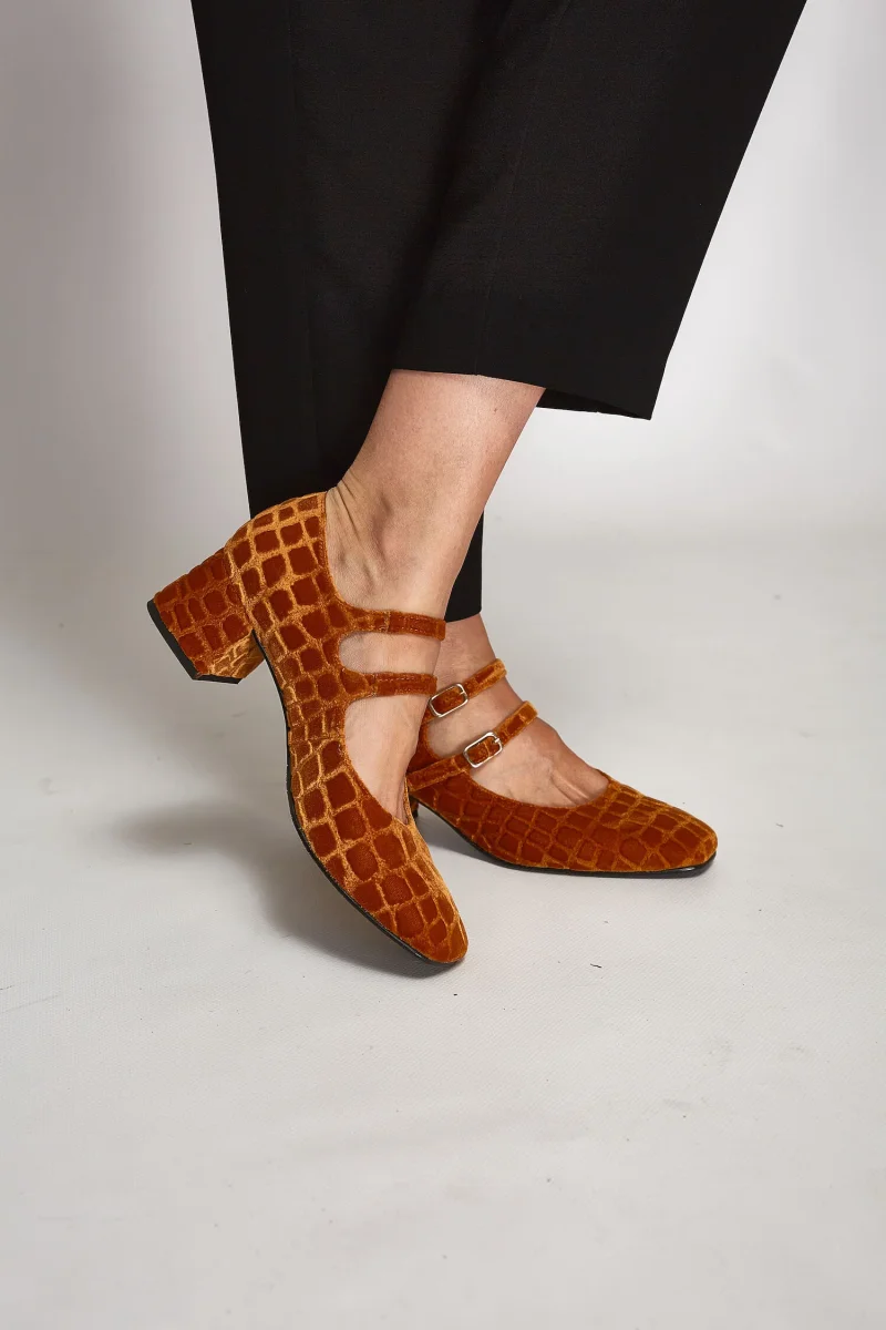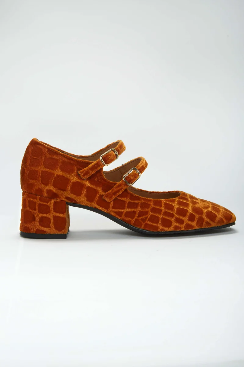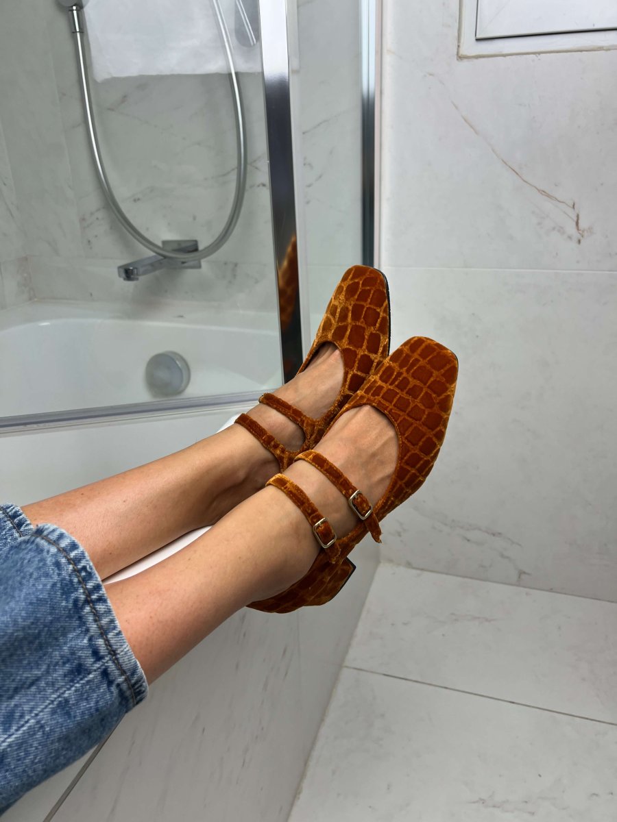 These square-toe midi heels are the perfect choice for those seeking comfort and style . With their original and elegant design, they’re made of coconut-print velvet , giving them a unique and sophisticated touch. They’re versatile , easy to combine, and very wearable, ideal for both sophisticated looks and more casual occasions. Add a touch of originality and elegance to your footwear with these comfortable and stylish heels.
